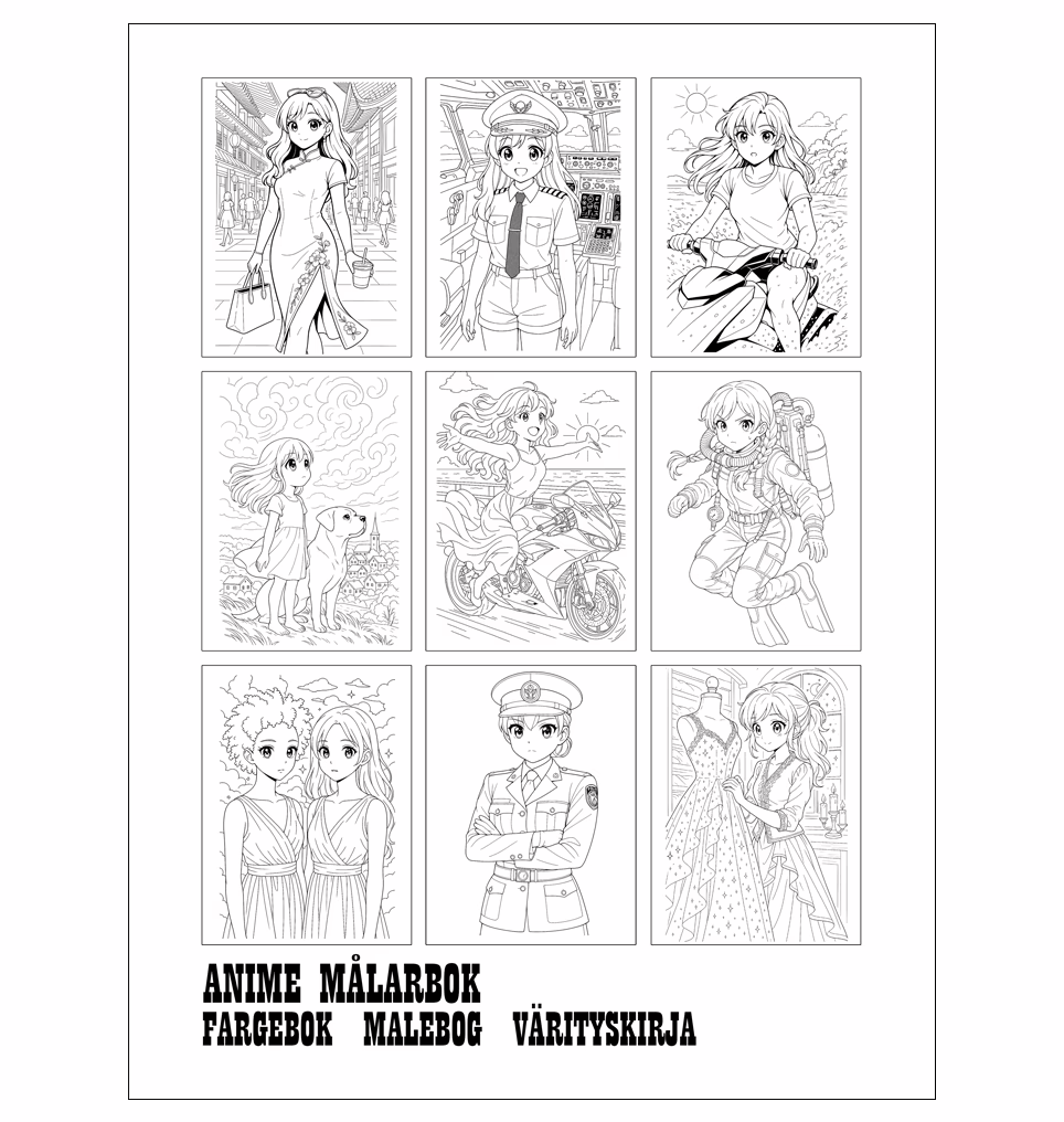Med en målarbok anime för vuxna bestämmer du själv färger, stämningar och känslor. Du kan ge varje figur en helt ny personlighet eller följa din egen konstnärliga vision. Varje sida blir ett blankt blad för fantasin – en plats där du kan vara både konstnär och berättare.