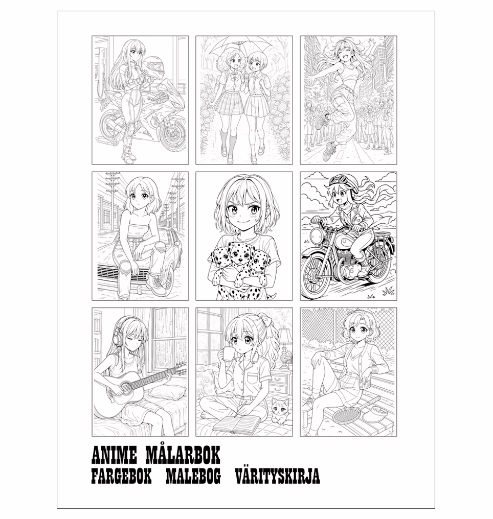 En målarbok anime i A4-format med 50 illustrationer, där varje motiv har en tom baksida för bästa färgläggningsupplevelse. Perfekt för avkoppling, kreativt uttryck och som en uppskattad present.