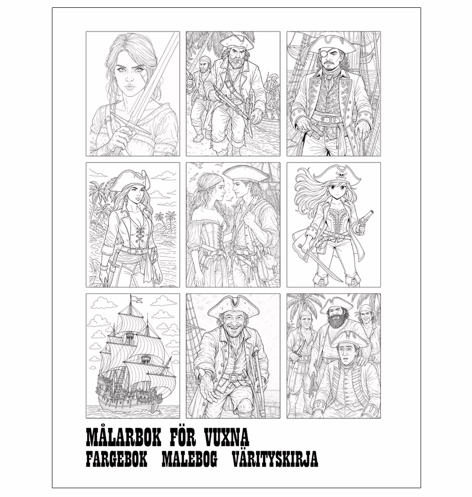 Om du älskar pirater kommer “Piraternas äventyr” att bli din favorit. Den här målarboken om pirater låter dig färglägga stormar, skattkartor och djärva kaptener som seglar över de sju haven. En perfekt målarbok för pojkar som drömmer om fartyg, svärd och skatter gömda på hemliga öar.