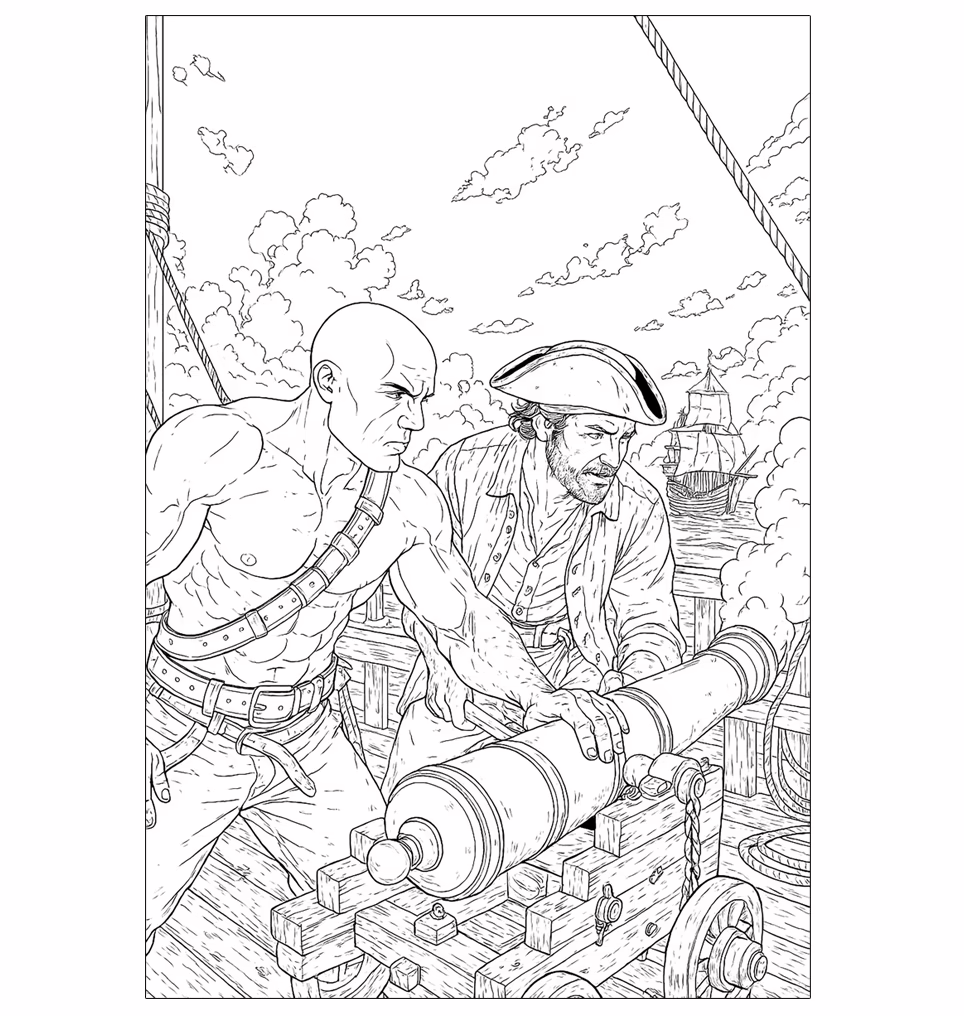 Den här målarboken för pojkar är skapad både för ungdomar och vuxna som älskar pirater och havets frihet. Tack vare svarta mellanblad mellan varje motiv kan du måla med tusch eller färgpennor utan att färgen går igenom. Det är inte bara en målarbok, det är ett äventyr på papper.