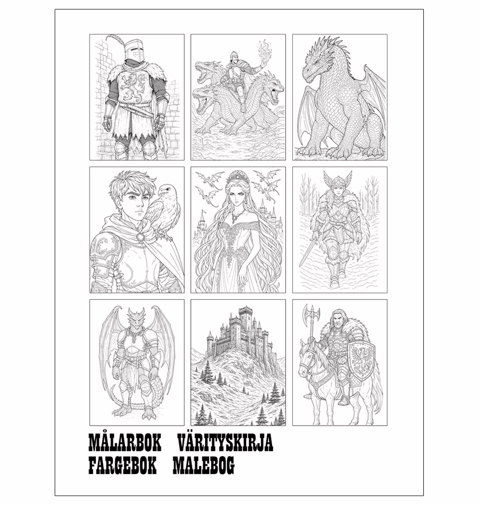 Följ med in i en värld där drakar flyger över slottsmurar och hjältar reser sig ur sagans dimma. Med fantasy målarboken “Riddare och Drakar” får du inte bara en bok – du får ett magiskt äventyr som väntar på att färgläggas sida för sida.
